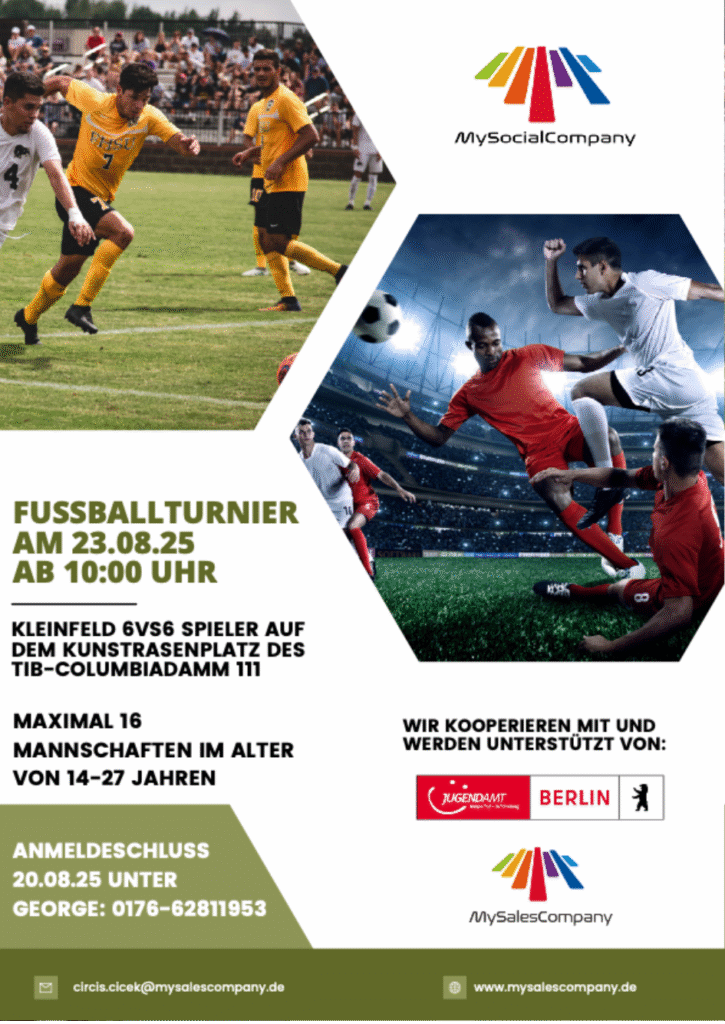 Das Turnier am 23.08.25 Auf dem Gelände des TIB-Columbiadamm fand mit viel Freude und Engagement statt. Die teilnehmenden Mannschaften hatten großen Spaß und es kam zu lebhaftem Austausch, was zu einem gelungenen Fest mit abschließender Siegerehrung führte. Die jüngste Mannschaft aus der Gemeinschaftsunterkunft Bessemerstraße gewann den Fairplay-Pokal.